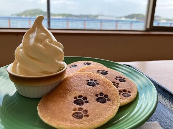 お風呂上りに、冷たいソフトクリームがたまりません。肉球パンケーキは、かわいくて食べるのがもったいないくらいです。