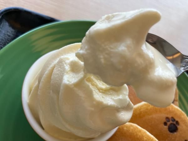 続いて「肉球パンケーキとミニソフトクリーム」。パンケーキの肉球がめちゃくちゃかわいいです!「ハンバーグとガーリックライス鉄板」でお腹いっぱいと言いながら、甘いものは別腹。こちらもぺろりと食べてしまいました。