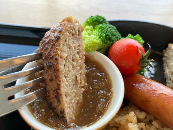 今回試食させていただいたのは、「ハンバーグとガーリックライス鉄板」と「肉球パンケーキとミニソフトクリーム」です。