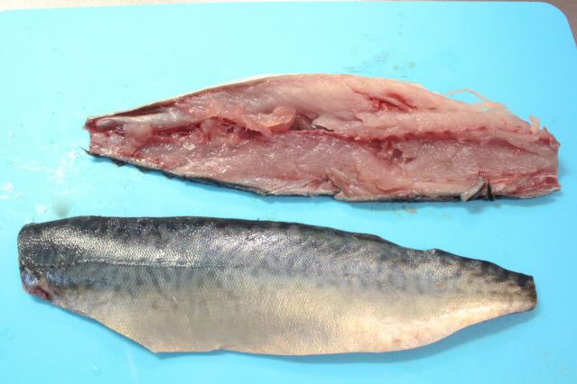 今回購入したサバは二枚おろしにしたものだったので、身と骨に切り分けました。上手に切り分けられず、骨部分に多く付いた身はスプーンでこそげとって、つみれとして別の料理に使うことにします。