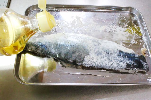 1. サバをバットにおき、両面に半量ずつの塩をすり込みます。