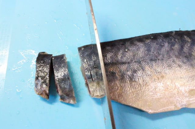 6. 5の中心にある小骨を抜いてかまを切り取り、頭の方から皮を剥きます。浅く飾り包丁を入れてから1cm幅に切ります。