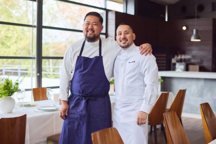 左から、『MANO』オーナーシェフの西本竜一と、『アルマーニ / リストランテ』のブルノ・昼間エグゼクティブシェル。