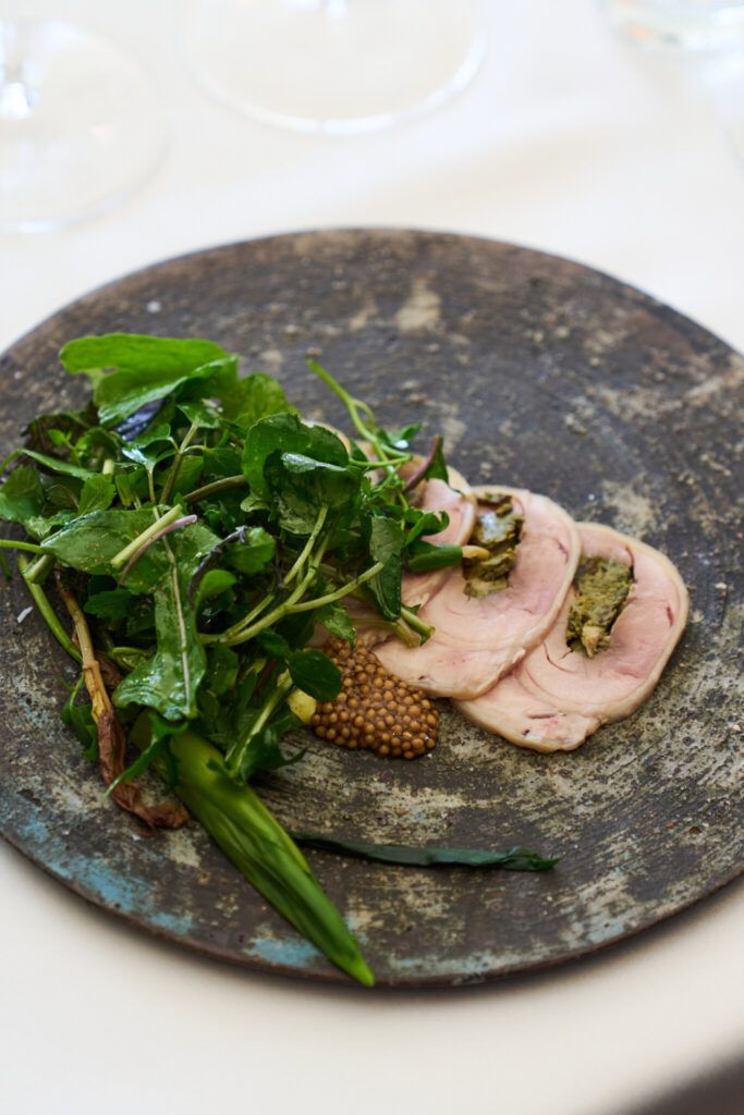 『MANO』西本シェフが提案する「信州黄金軍鶏と山菜の自家製ハム、クレソンと野草のサラダ仕立て」。