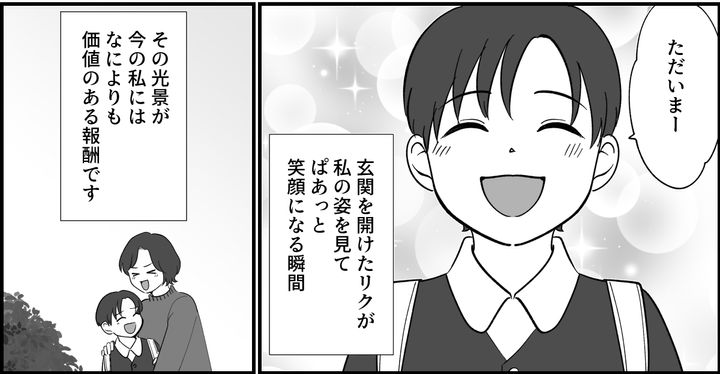 「正社員を辞めるなんてもったいない」というダイスケの反対を押しきり、今の私は正社員という働き方を辞めました。同じ会社に勤め続けているものの部署は変わり、現在は週3日のパート勤務。リクが学校から帰る時間に「おかえり」と家で迎える生活を選びました。