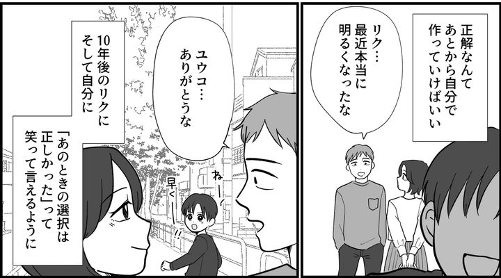 別れ際、ツグミちゃんの後ろ姿を見送りながら、私はどこかスッキリとした気持ちでした。家計のやりくりは少し厳しくなりましたが、ダイスケもリクの落ち着いた様子を見て「ユウコが家にいてくれたおかげだ」と言って感謝してくれるようになりました。