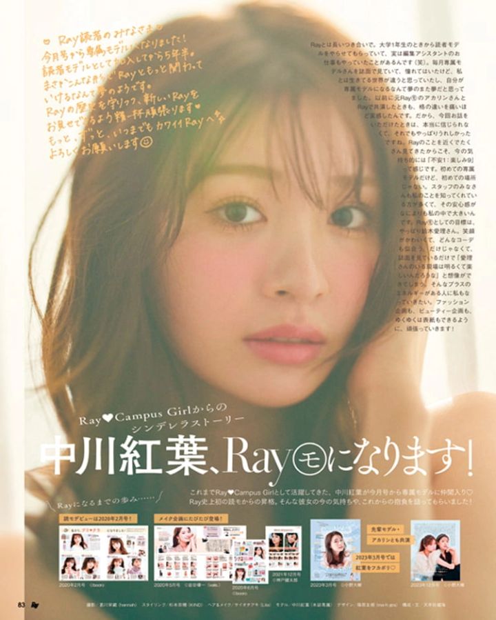 Ray専属モデルに就任し、今ではRay㋲のムードメーカー的存在にまで成長した中川紅葉。今回は、そんな紅葉がこれまでたどった「サクセスストーリー」をお届けします。一見すると順風満帆に見える紅葉の芸能人生。成功に至るまでの裏側をぜひチェックしてみて!