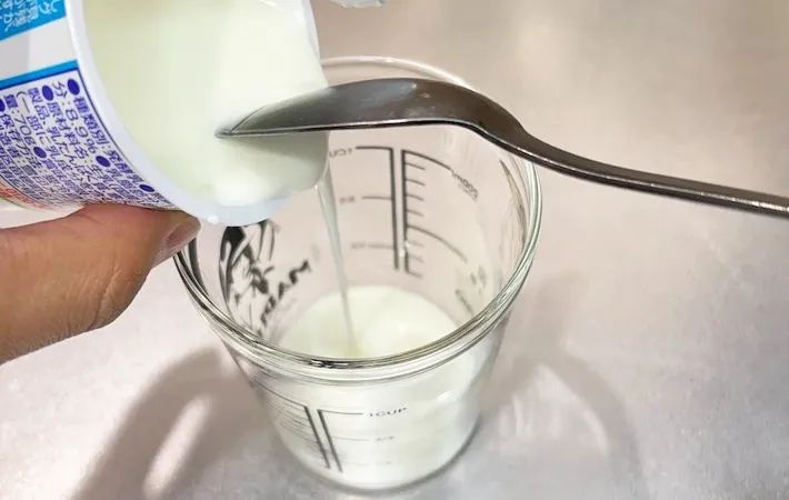 よく振った『牧場の朝』を容器に移し替えます。スプーンでやさしくすくい出し、容器全体に均一に広げましょう。