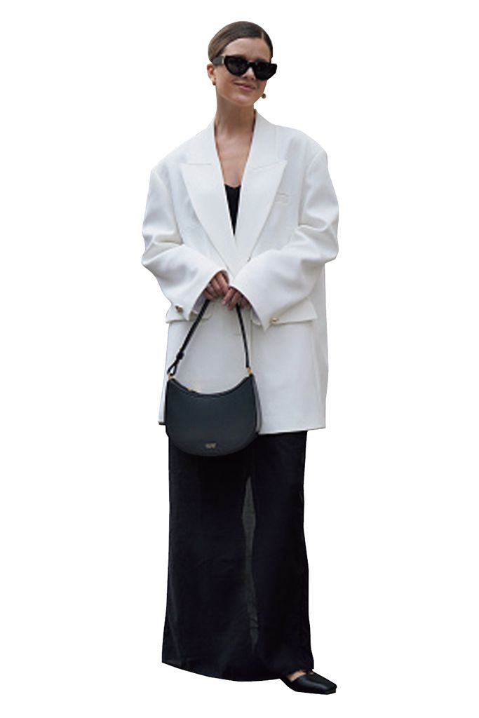 クリーンな白のオーバーサイズジャケットが主役。インナーとボトムをすべて黒でつなぐことで、ジャケットのボリューム感が際立ち、モードな雰囲気が加速。注目したいのは、シャープなVネックの開きと、足元のポインテッドトゥ。上半身と足先に「直線」を意識させることで、全体のシルエットが膨張せず、縦のラインを強調。