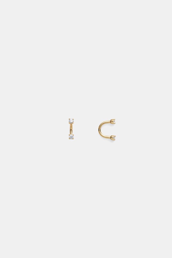 耳たぶに沿うCカーブデザインのピアスは、石座をあえて極小に仕上げることで、2粒のストーンの輝きだけが耳元に浮かぶようにデザイン。キャッチはねじ式のスクリュータイプを採用し、軽やかな着け心地はそのままに、日常の動作での引っ掛かりや紛失リスクを軽減。シンプルな一粒ピアスとは一味違う、こなれ感ある個性をプラスしてくれる。
