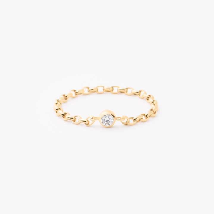 一粒ダイヤモンドを星に見立てたチェーンリングは、願いが叶うよう想いを込めて纏いたいデザイン。丸みを帯びたチェーンは肌あたりが滑らかで、着けているのを忘れるほど軽やか。ダイヤモンドはベゼル留めのため引っ掛かりが少なく、裏抜けを抑えた構造でお手入れのしやすさも嬉しい。