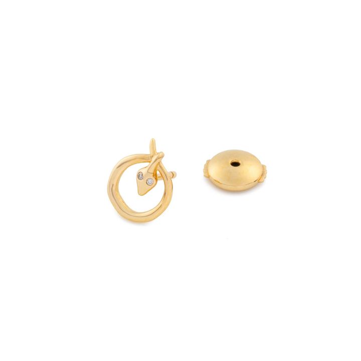 古来より魔除けや開運のシンボルとして親しまれてきたスネークモチーフを、サークルシルエットで表現したピアス。しなやかに絡みつくスネークの造形が、耳元に静かなスパイスを添えてくれる。両目にはダイヤモンドをあしらい、リュクスな煌めきをプラス。24時間着用しても気になりにくい、ディスクキャッチ仕様なのもポイント。