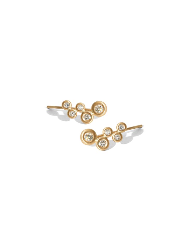 耳を挟み込むように着用するクリップタイプのピアス。まるで息を吹きかけてぷっくりと膨らませたようなゴールドのモチーフの中に、煌めくダイヤモンドをセット。内部を空洞にしたゴールドの構造が、ダイヤモンドの輝きをいっそう際立たせながら、驚くほど軽やかな着け心地を生み出す。グラデーション状に配されたダイヤモンドが星座のように連なり、希望に満ちた輝きを耳元に添える。