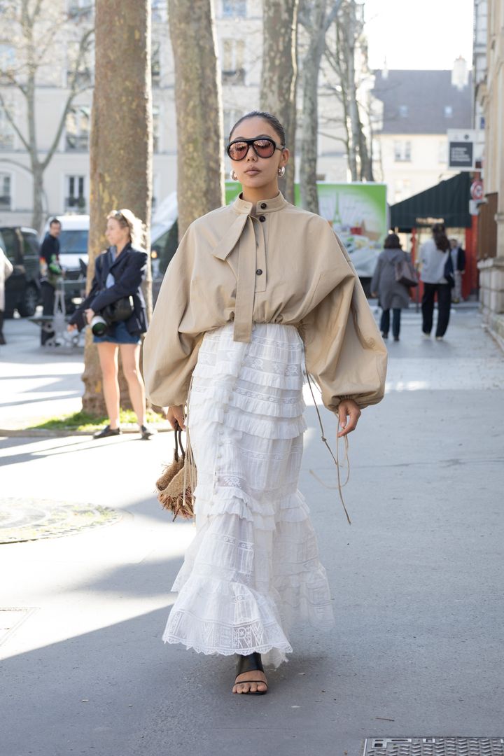 重なり合うフレア、たっぷりとしたドレープ、ボリューミーなモチーフ使い……今季、注目したいのは、一瞬で視線を集めるステートメントなボリューム&フレアスカート。着こなしは、スキニーなトップスを合わせたり、ウエストインするなど、フィット&フレアを意識。レースやフラワーモチーフといった甘さの高いデザインが多いので、ベージュや黒でモード&ヘルシーに仕上げるなど、カラーバランスも調整して。