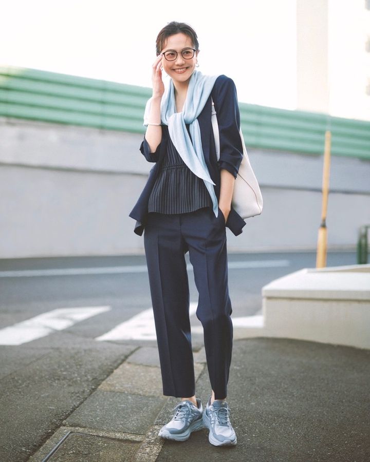 ジャケット¥46,200ブラウス¥26,400パンツ¥29,700(すべてTheory)ストール¥29,700(アソース メレ/アイネックス)バッグ¥82,500(ジャンニ キアリーニ/ジャンニ キアリーニ 銀座店)スニーカー¥19,800(ニューバランス/ニューバランス ジャパンお客様相談室)眼鏡¥49,500(アイヴァン/アイヴァン 東京ギャラリー)バングル¥28,600〈ワンエーアールバイウノアエレ〉ピアス¥25,300〈ウノアエレ シルバーコレクション〉(ともにウノアエレ ジャパン)