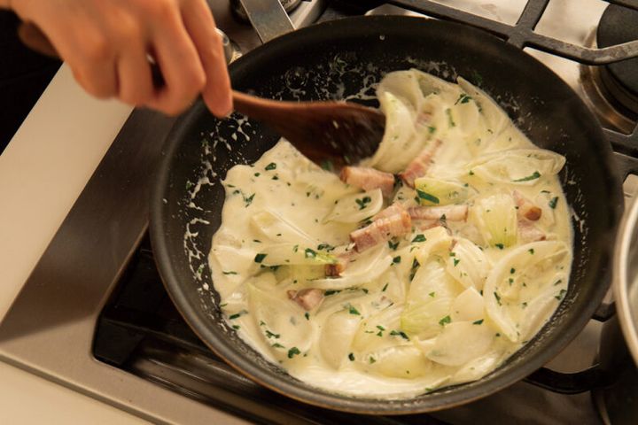 玉ねぎを生クリームでしばらく煮て、旨味をしっかり吸わせる。
