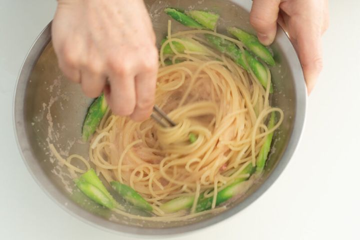 3. ゆで上がったパスタとアスパラガスをザルにあげ、さっと1のボウルに入れ、よく混ぜる。
