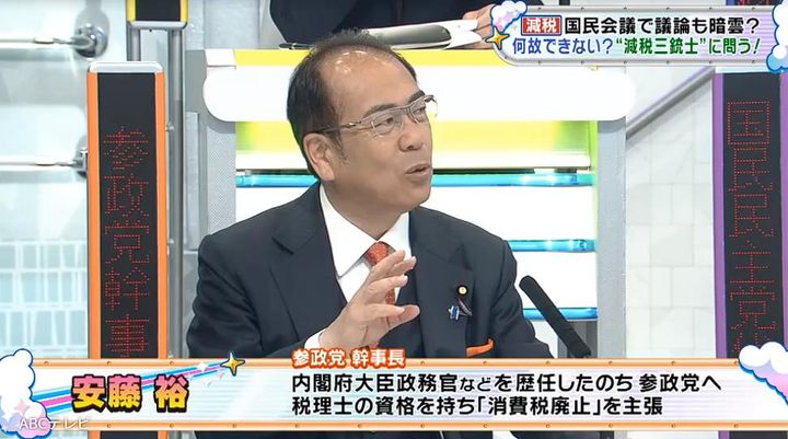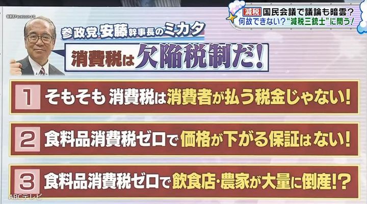 番組では食料品だけを対象にした減税について、単純な話ではない実態が示された。参政党幹事長の安藤裕議員は、物価は需要と供給のバランスで決まることから、消費税をゼロにしても価格が下がる保証はないと説く。さらに、現行制度では飲食店の税負担が逆に増えると説明。食料品の消費税ゼロ=負担軽減とは言い切れない現実が浮き彫りとなった。