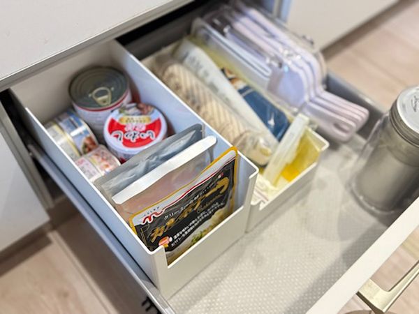 ケースを使って食品を立てて収納すると、中身が見やすくなり、在庫管理がしやすくなります。結果として食品ロスの防止にもつながります。防災備蓄は「用意すること」だけではなく、「管理しやすいこと」も大切。収納を整えることで、防災のハードルはぐっと下がります。