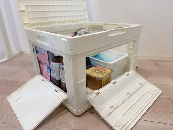 このコンテナは5方向から開閉できる構造になっており、上からだけではなく側面からも中のものを取り出すことができます。積み重ねた状態でも中身を取り出せるため、収納の自由度が高いのが特徴です。