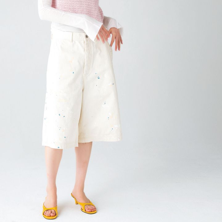 ヴィンテージライクなデニムに、大胆なフレアシルエットで女性らしさをひとさじ。ハーフパンツ ¥38,500(イレーヴ TEL. 03-5785-6447) サンダル ¥46,200(ジェーン スミス/ジョン メイソン スミス ジェーン スミス ストア)