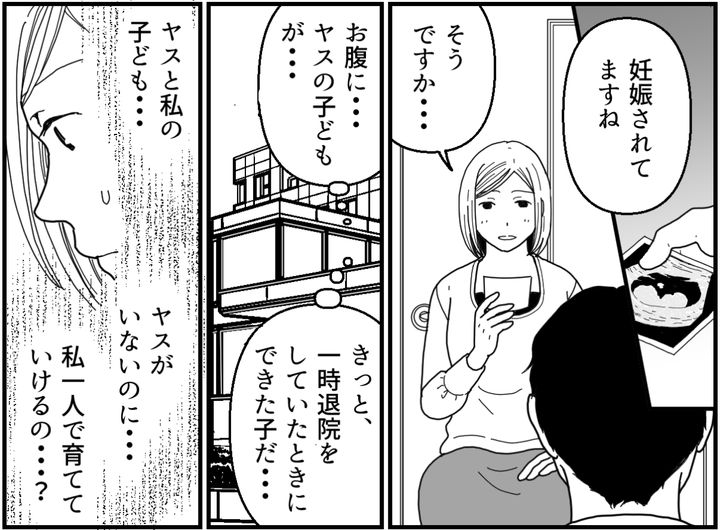 私(リエ)は、夫のヤスタカと2人暮らしでした。義両親はすでに他界し、義実家にはシングルマザーである義妹ヒナちゃんが子どもたちと暮らしています。私たち夫婦は子どもを持つことに積極的ではありませんでした。夫がうまく言ってくれて、周囲には「子どもができにくい体質」だと思われていました。そんな優しい夫がある日、入院したまま亡くなってしまいます。悲しみに暮れるなか……私は身体の変化に気が付きます。心当たりはありました。