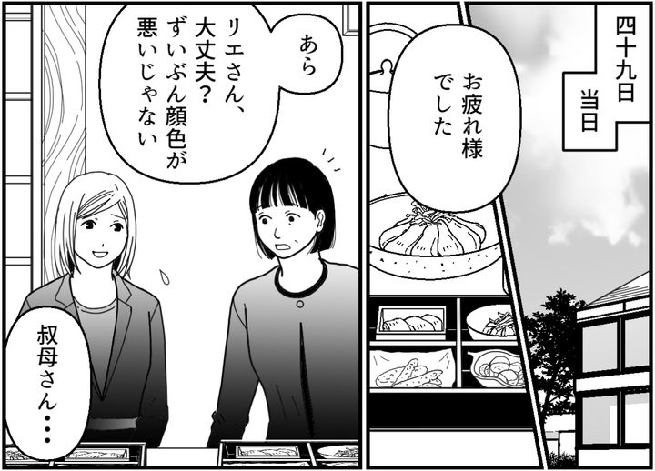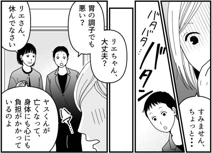急いでトイレに駆け込んで吐くと、親戚たちがザワついていました。「気の毒に」「そりゃ仕方ないわよ」「ヤスくんが亡くなって間もないものね」そんな声が聞こえてきます。ヒナちゃんと叔母さんが心配して駆け寄ってきました。
