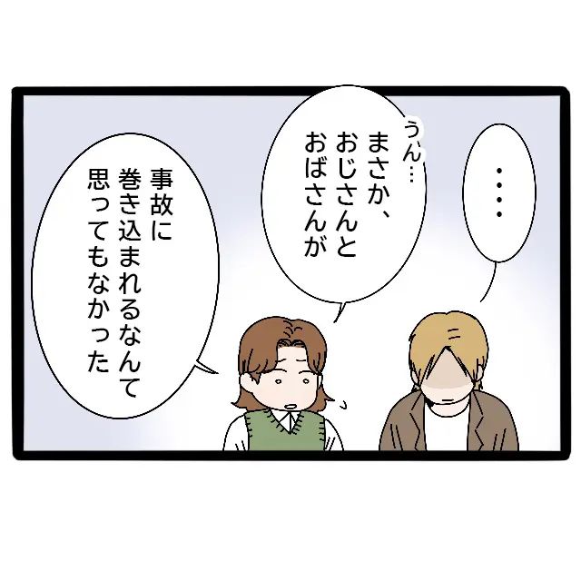 隆明の話に、よっちゃんはこくりとうなずいて、「うん・・・まさか、おじさんとおばさんが事故に巻き込まれるなんて思ってもなかった」と、悲しげな表情を浮かべます。一方の兄は、隆明の言葉を前に、ただ黙ってうつむいていました。