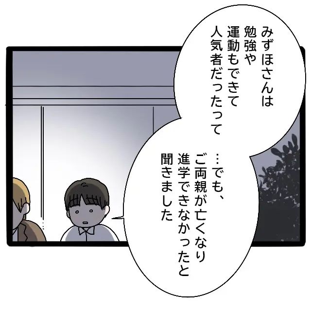 よっちゃんは当時を思い出すように、「どうしようもないことだけどさ、進学出来ないこと、先生も成績いいのにもったいないって言ってたんだよね」と話しました。みずほ先輩は誰もが認める優等生で、進学するのは当たり前だと思っていました。だけどご両親を亡くしたことで大学への道は閉ざされ、本来描けたはずの未来を断たれてしまったのです。