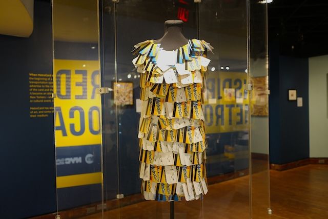 なかでも目を引くのが、実際のメトロカードを素材にして制作されたドレスです。何枚ものカードが丁寧に組み合わされ、質感や色の重なりが一着の作品として成立している様子は、素材の意外性も相まって強い印象を残します。
