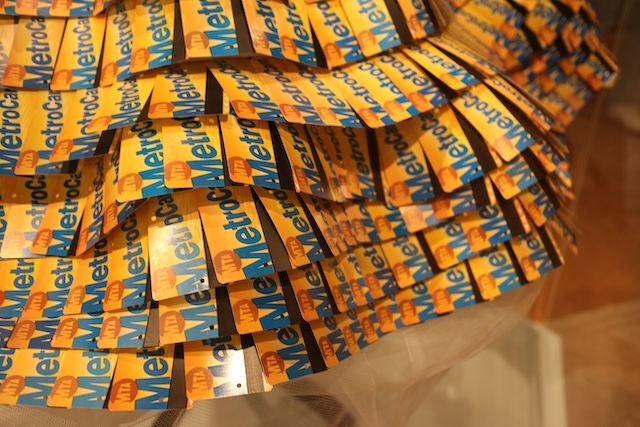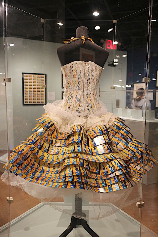 注目は、ジャーナリストのNina Vishneva(ニーナ・ヴィシュネヴァ) による作品。解説によると、「制作のきっかけは2005年のニューヨーク地下鉄・バスのストライキ(transit strike) の際、街中にあふれたメトロカードを収集し始めたことが、カードを使った衣服制作のアイデアの原点になった」と語っています。