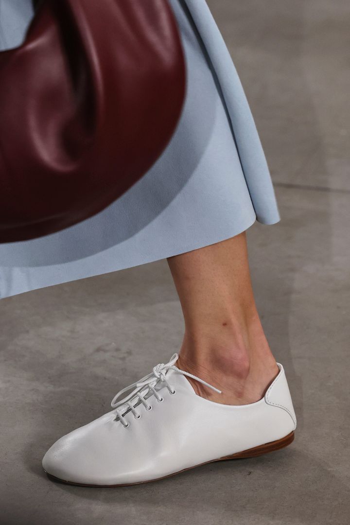 今季のトレンドの多くはレトロリバイバルの気配を帯びているが、ダービーシューズはまさにその象徴。ボウリングバッグの姉妹的存在で、どちらもミッドセンチュリーのデザインに根ざし、1950〜60年代へのオマージュを感じさせつつ、モダンな空気をまとっている。「セリーヌ」が今シーズンのダービーの決定版を打ち出しており、オックスフォードやレースアップのドレスシューズを思わせるコントゥアラインが特徴的なレザー仕立てが典型的なスタイル。それでいてスリムなフォルムがフォーマルになりすぎるのを防いでいる。