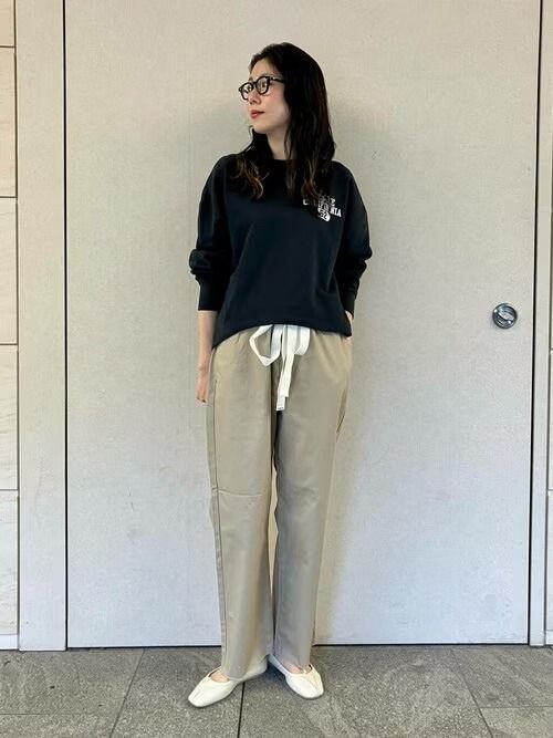 スウェットがスポーティーなので、シューズはスニーカーよりフラットシューズを、バッグはリュックよりもきれいめのミニバッグを合わせる、また写真のように眼鏡をプラスするなど小物まで意識してまとめると、おしゃれ度もアップ!