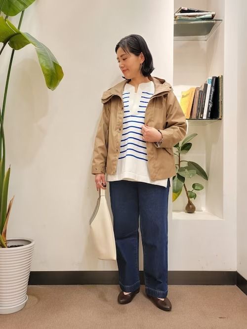 インナーにはボーダーでも大人っぽい印象に仕上がるスキッパー襟のニットを。そしてデニムとフラットシューズを合わせて、大人の休日コーデに。