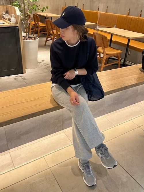 「大人の女性には難しい」という声もあるカジュアルなスウェット。ですが、スウェットの代表的なカラーであるライトグレーなどに比べて、ブラックや写真のようなネイビーなどのダークカラーを選ぶと、比較的大人っぽく着こなせます。部屋着やパジャマのように見えにくいのでイチ押しです。