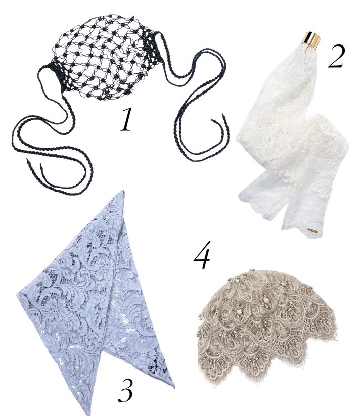1 ワイヤを緻密に編み上げた存在感のある一品。ヘッドピース¥18,700/フェティコ(ザ・ウォール ショールーム) 2 ヘアカフとレースが一体になったユニークなデザイン。ポニーフック¥25,300/エントワフェイン 3 細かなレース柄で、巻き方次第でさまざまな表情を演出する。スカーフ(W110×H52㎝)¥39,600/ミュールバウアー(アッシュ・ペー・フランス) 4 ビジューを施したドラマチックな佇まい。ヘッドピース¥79,200/タナカ ダイスケ