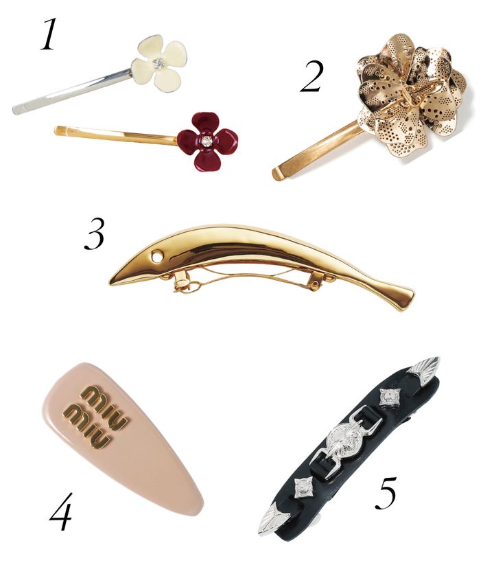 1 普段使いしやすい小花モチーフ。ヘアピン セット¥50,600/マルニ(マルニ ジャパン クライアントサービス) 2 ゴールドでレースを表現。ヘアピン¥40,700/ジミー チュウ 3 バッグにデザインされている、サーディンを採用。ヘアピン¥90,200/ボッテガ・ヴェネタ(ボッテガ・ヴェネタ ジャパン) 4 パテントレザーでポップに。ヘアピン¥61,600(予定価格)/ミュウミュウ(ミュウミュウ クライアントサービス) 5 シルバーのスタッズが映える。バレッタ¥17,600/トーガ トゥ(トーガ 青山店)