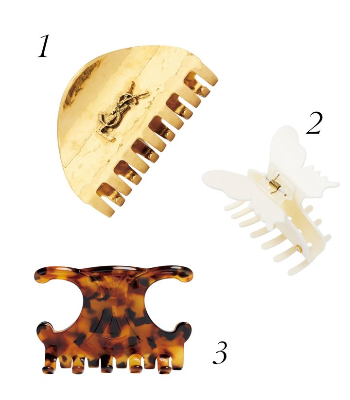 1 ゴールドにきらめき、アンティークなムードが漂う。クリップ¥79,200/サンローラン バイ アンソニー・ヴァカレロ(サンローラン クライアントサービス) 2 髪をまとめやすいバタフライ形。クリップ¥8,800/アンダーカバー 3 ブランドロゴ、トリオンフのシルエットをヘアクリップに。クリップ¥83,600(予定価格)/セリーヌ(セリーヌ ジャパン)
