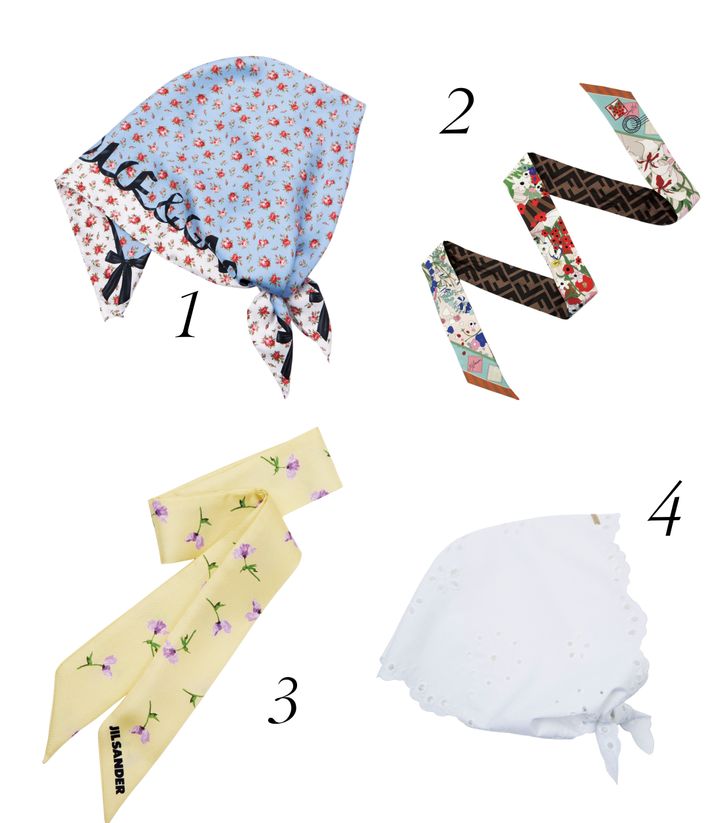1 小花とリボンがあしらわれたロマンチックなデザイン。スカーフ(W90×H90㎝)¥104,500/ドルチェ&ガッバーナ(ドルチェ&ガッバーナ ジャパン) 2 両面で違う柄は結び方で、いろいろな表情を楽しめる。スカーフ(W5×H120㎝)¥35,200/フェンディ(フェンディ ジャパン) 3 リボンやヘアバンド代わりにも巻きやすい細長タイプ。スカーフ(W5×H100㎝)¥42,900/ジルサンダー(ジルサンダージャパン) 4 レースがアクセントになったシンプルな一枚。スカーフ(W103×H47㎝)¥33,000/ヘルノ(ヘルノ・ジャパン)
