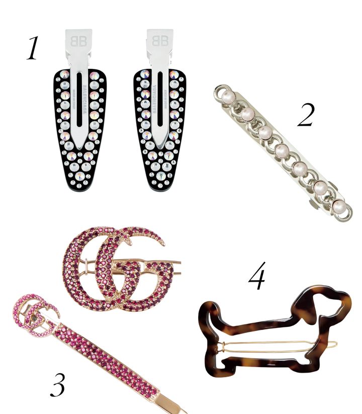 1 きらめくストーンを贅沢に使用。ヘアピン セット¥81,400(予定価格)/バレンシアガ(バレンシアガ クライアントサービス) 2 パールをあしらいプレシャスな雰囲気。ヘアピン¥61,600/ロジェ ヴィヴィエ(ロジェ・ヴィヴィエ・ジャパン) 3 ピンククリスタルは存在感抜群。ヘアピン セット¥132,000/グッチ(グッチ クライアントサービス) 4 アイコニックなドッグシェイプ。ヘアピン¥72,600/トム ブラウン(トム ブラウン ジャパン)