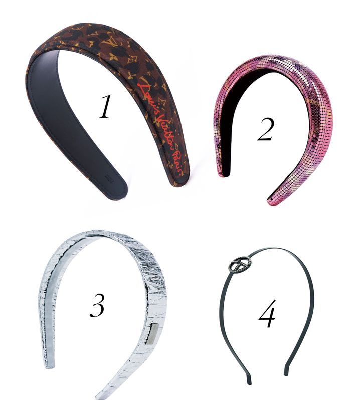 1 “モノグラム”とレオパードを合わせたアイコニックな柄。カチューシャ¥83,600/ルイ・ヴィトン(ルイ・ヴィトン クライアントサービス) 2 ピンクのチェックプリントを柔らかなメッシュ加工に。カチューシャ¥77,000/バーバリー(バーバリー・ジャパン) 3 シルバーホイルのようなデザインは、大胆な存在感を放つ。カチューシャ¥39,600/エムエム6 メゾン マルジェラ(マルジェラ ジャパン クライアントサービス) 4 ミニマルなデザインであらゆるシーンにマッチ。カチューシャ¥81,400/ジョルジオ アルマーニ(ジョルジオ アルマーニ ジャパン)