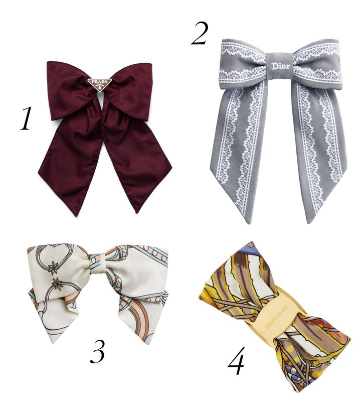 1 上品なムードが漂うバーガンディ。素材にはリナイロンを使用。バレッタ¥115,000(予定価格)/プラダ(プラダ クライアントサービス) 2 繊細でドラマチックなレースがグレー地に映える。バレッタ¥115,000/ディオール(クリスチャン ディオール) 3 シルクツイルのカッティングと組み合わせはアイテム次第。バレッタ¥105,600/エルメス(エルメスジャポン) 4 シルク素材の中央に映えるプレートが印象的。バレッタ¥42,900/フェラガモ(フェラガモ・ジャパン)