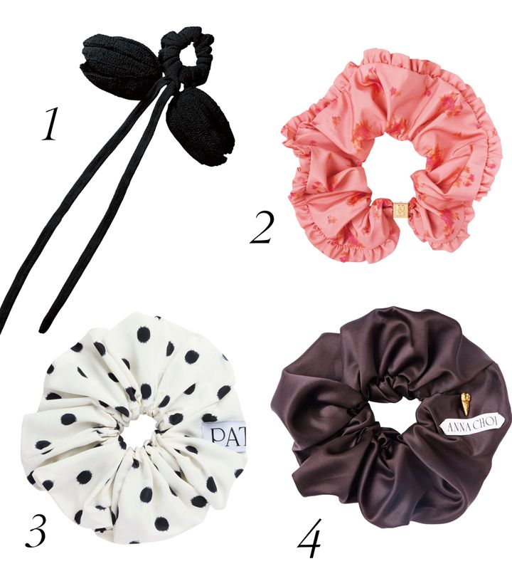 1 チューリップ付きのシュシュはリボン感覚で楽しんで。シュシュ¥17,600/ラインヴァンド(ラインヴァンド カスタマーサポート) 2 フェミニンなピンクは重ねるとカーネーションのようなフォルムに。シュシュ¥10,340/ガニー(ガニー 渋谷パルコ) 3 白黒のドット柄は幅広いスタイルにマッチ。シュシュ¥23,100/パトゥ(イザ) 4 ツヤが美しいパープルで、品格あるスタイルへ。シュシュ¥16,500/アンナ チョイ(アンナ チョイ クライアントサービス)