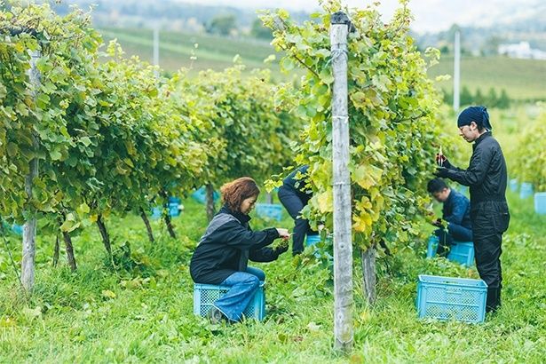 アリビアーモのバーテンダー5名でブドウの収穫を手伝い、平川さんから直接、土地の土や気候、ブドウなどに対する想いなどを伺ったそう。時につまみ食いをしながら、ぶどう棚で摘み取りをし、収穫後は平川さんとともに青空の下でワインを傾けたという。