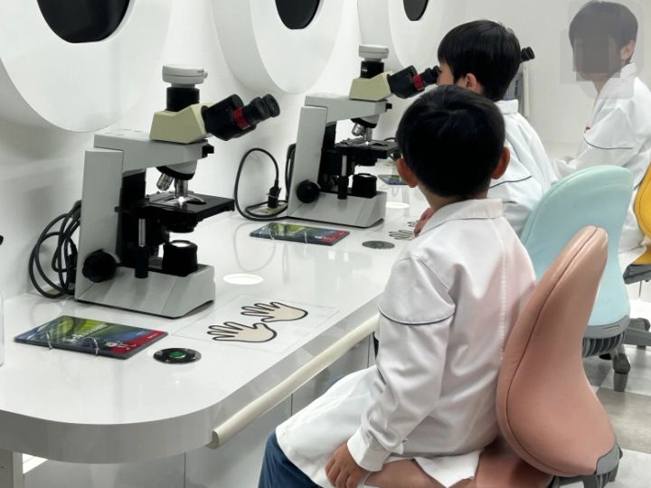 そこからの仕事体験への没入感はさすがのキッザニア。子どもたちが飽きないように作られています。例えば、ビーカーなどの器具を使ったり、顕微鏡をのぞいたり、次男が私を確認することも減ってきていい感じ!