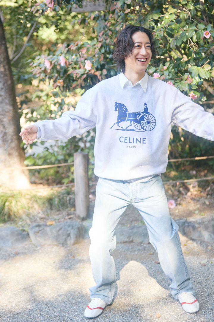 スウェットシャツ¥154,000 シャツ¥159,500 ジーンズ¥159,500 スニーカー¥121,000 (すべて予定価格)/以上セリーヌ(セリーヌ ジャパン)