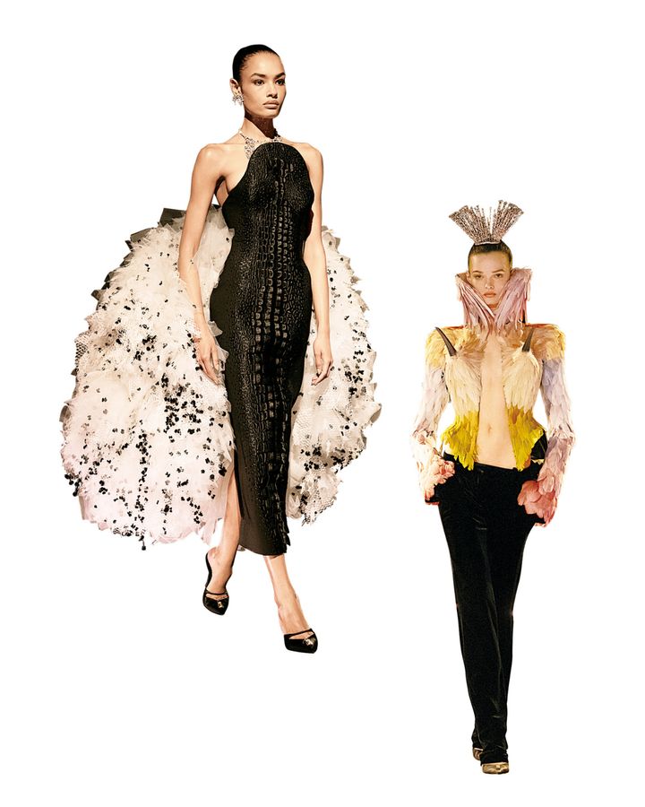 ダニエル・ローズベリーが手掛けるSCHIAPARELLI(スキャパレリ)は今季、「どう見えるか」に代わって「どう感じるか」に注力。鳥や爬虫(はちゅう)類を連想させるドラマティックなデザインを通し、毒を秘めたロマンティシズムを妖艶に描き出しています。動物由来の素材を使用せずに、卓越したサヴォアフェールで表現している点が現代的です。