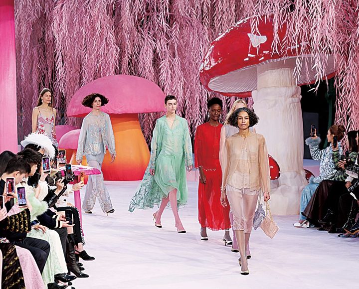 マチュー・ブレイジーのクチュールデビューの舞台は、幻想的なキノコの森。シャネルが描く女性像を美に触れ自由に飛び立つ鳥に重ね、メゾンのコードをこの上なくエアリーに進化させています。アイコニックなスーツスタイルは、透けるシルクモスリンで仕立て、究極まで軽快に。多用されたシフォンやフェザーが風に舞い、繊細な手仕事を引き立てます。リリカルな趣と現代性が融合したコレクションで好発進。
