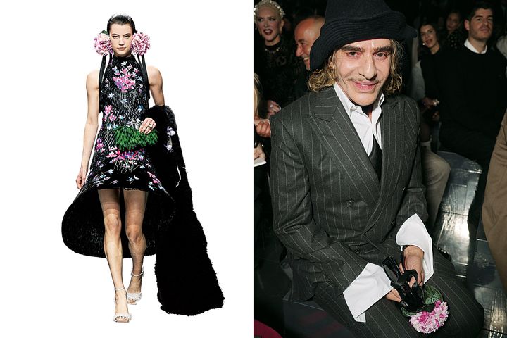 ディオールの会場に、かつてデザインを指揮したジョン・ガリアーノが来場。ジョナサン・アンダーソンは、ガリアーノから贈られた黒いリボンで結ばれたシクラメンを着想源の一つとしてコレクションを構築し、メゾンのヘリテージと先人の功績をたたえました。