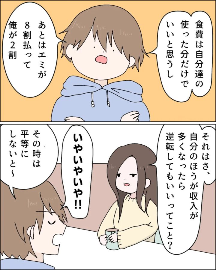 「食費は自分達の使った分だけでいいと思うし、あとはエミが8割払って俺が2割」そんなことを、レイは当たり前のような顔で口にします。しかし私が「それはさ、自分の方が収入が多くなったら逆転してもいいってこと?」と聞くと、レイは「いやいやいや!その時は平等にしないと~」と一言。それって結局、自分がお金を負担したくないだけなんじゃ?